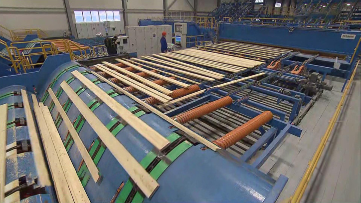 Президенту показывают цех , где станки еще иностранные, а резаки в них уже родом из России. Этот конвейер выпускает по 400 тысяч кубометров досок в год.