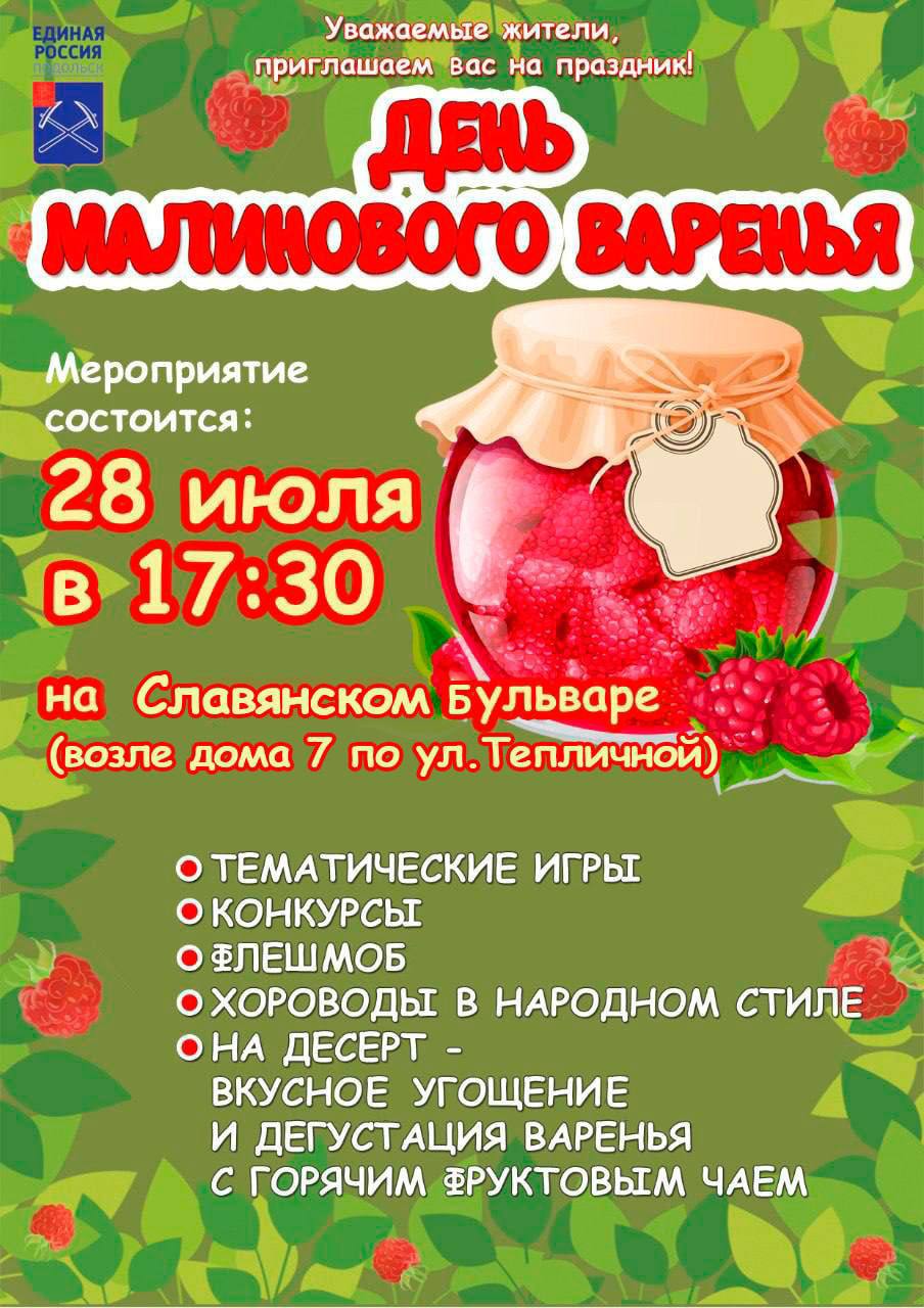 Для юных подольчан проведут интерактивную программу: тематические игры; конкурсы; флешмоб; хороводы. Организаторы подготовят для гостей угощение: пирожки с разными видами повидла, дегустацию варенья с малиной, клубникой, персиком, вишней и другими вкусами, а также горячий фруктовый чай. Славянский бульвар, возле дома по адресу улица Тепличная, дом 7. Пятница, 28 июля, в 17:30. Источник и фото: «Официальный Подольск»