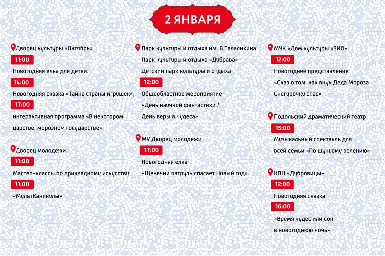 С Новым годом, друзья! В новогодние выходные некогда скучать, ведь парки и муниципальные учреждение Подольска подготовили обширную программу для всех желающих.
