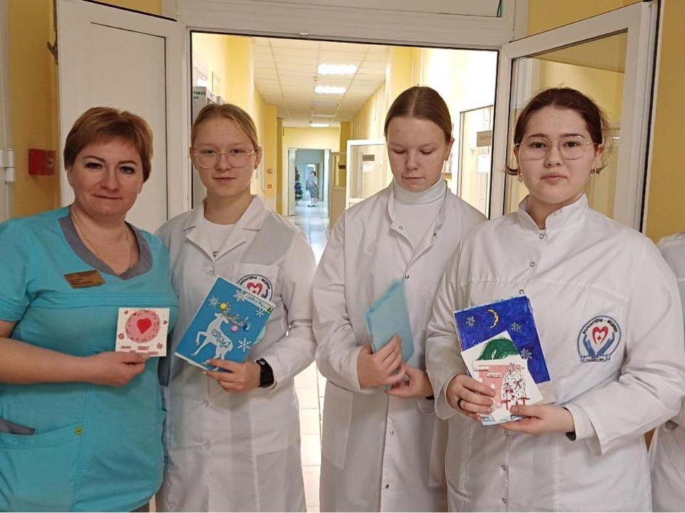 Новогодние открытки с теплыми пожеланиями в отделения Коломенской больницы доставили волонтеры-медики — учащиеся 9-го медицинского класса гимназии № 9.