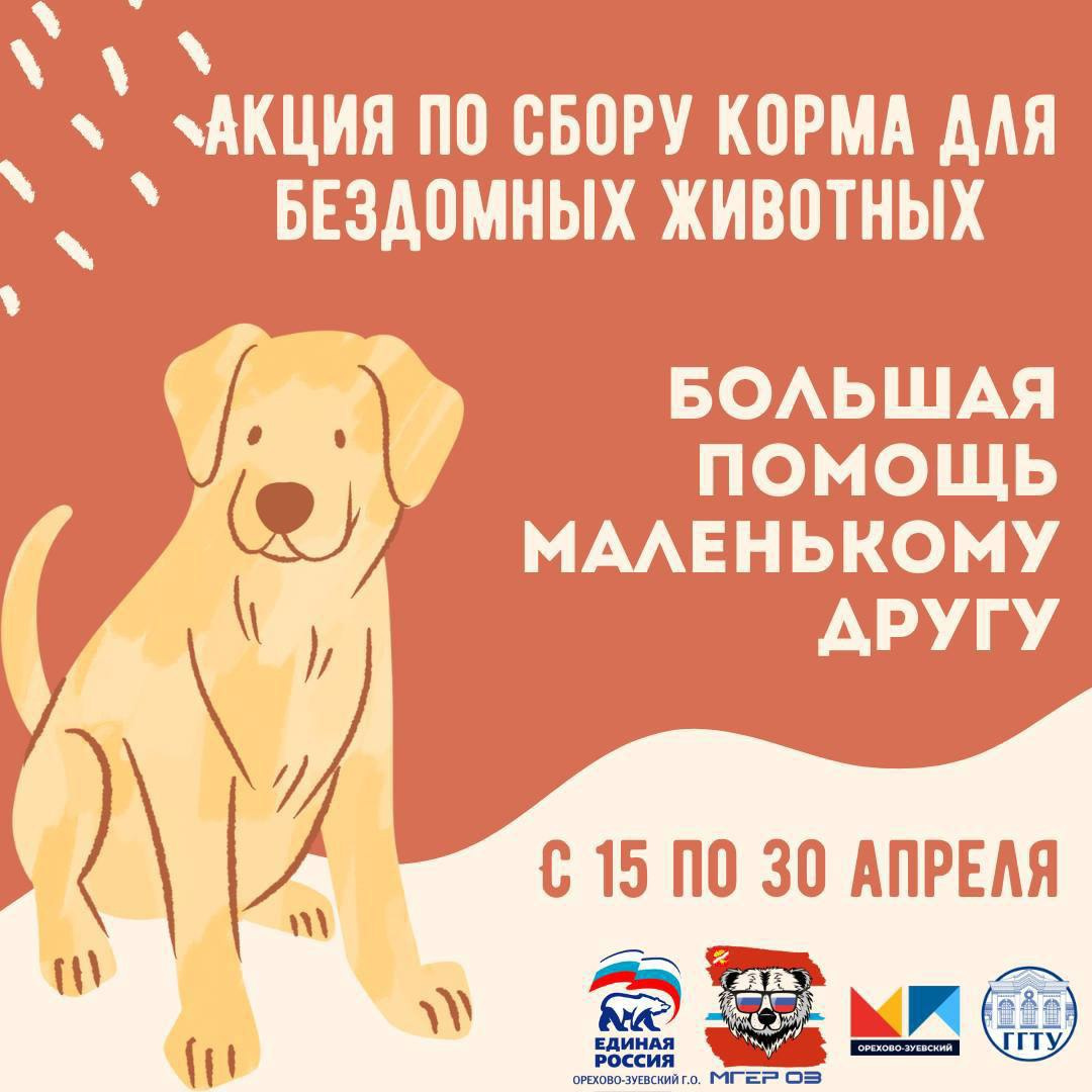 В рамках Федерального партийного проекта «Защита животного мира» партия «Единая Россия» совместно с МГЕР, Молодёжным парламентом при Совете депутатов Орехово-Зуевского округа и ГГТУ запускает благотворительную акцию в поддержку бездомных животных «Большая помощь маленькому другу».