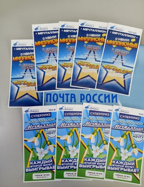 Целевые отчисления от продажи лотерейных билетов — это вклад в развитие отечественного спорта. В почтовых отделениях клиенты могут приобрести билеты тиражных и моментальных лотерей. Кроме того, в отделениях Почты можно узнать результаты предыдущих телевизионных розыгрышей и получить выигрыш, сумма которого менее 15 000 руб.