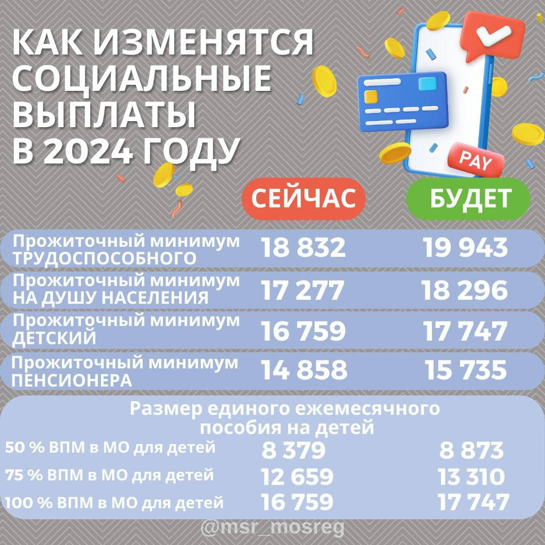 Как изменятся социальные выплаты в 2024 году — информация для ореховозуевцев С 1 января нового 2024 года величина прожиточного минимума в Подмосковье увеличится и ряд социальных выплат тоже.