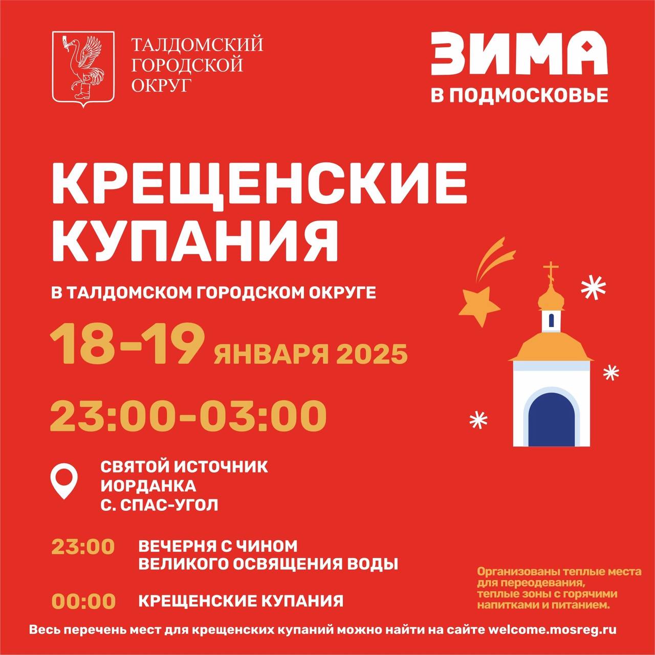 В ночь с 18 на 19 января в Талдомском округе пройдут традиционные Крещенские купания. В связи с погодными условиями принято решение о запрете омовения в открытых водоемах.
