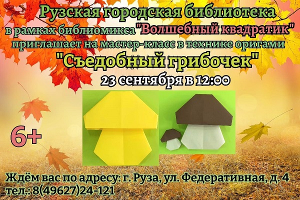 В Рузской городской библиотеке 23 сентября состоится мастер-класс «Съедобный грибочек» в рамках библиомикса «Волшебный квадратик».