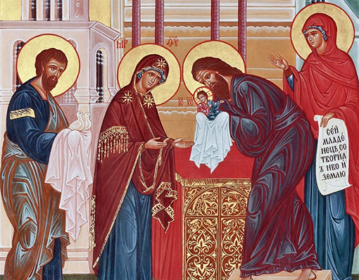 Праведный и благочестивый старец Симеон, пришедший по Божьему вдохновению в Храм в надежде на исполнение Божьего обещания, что «он не увидит смерти, доколе не увидит Христа Господня», встречает Владыку неба и земли с Его Пречистой Матерью и праведным Иосифом Обручником. Симеон, глядя на Ребенка, Которого принесли не Ангелы, а простые люди, увидел обещанного Богом Спасителя – благодаря вере, преисполненной надеждой, увидел немеркнущий Свет… Радость долгожданной встречи с Тем, Кто пришел спасти всех людей, принеся Себя в жертву за их грехи, ясно слышится в последней молитве праведного Симеона Богоприимца. Он возвещает, что Христос есть «Свет во откровение языков (т.е. к просвещению народов) и слава людей … Израиля», т.е. тех, кто уже верует в Единого Бога.