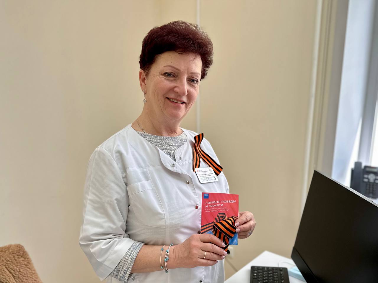 Каждый обратившийся в медучреждение также имеет возможность на стойке регистратуры получить георгиевскую ленточку и памятку о правильном ее ношении.